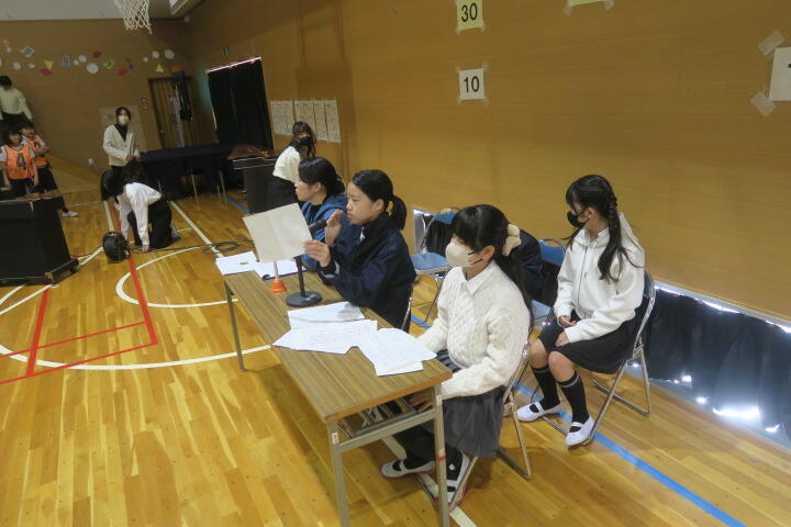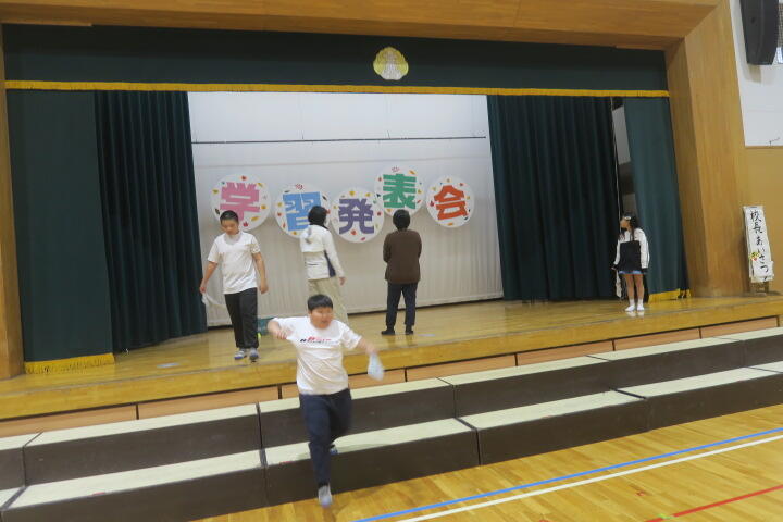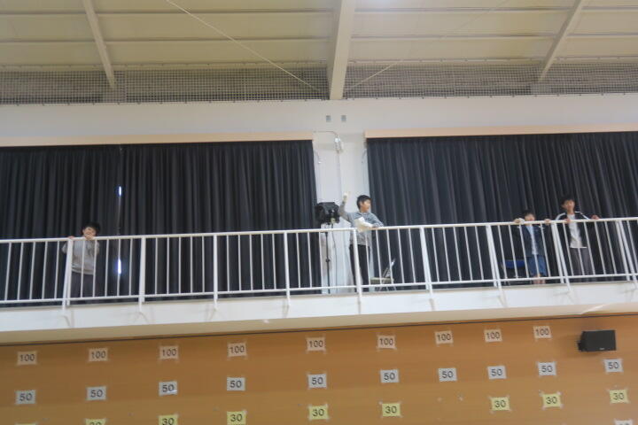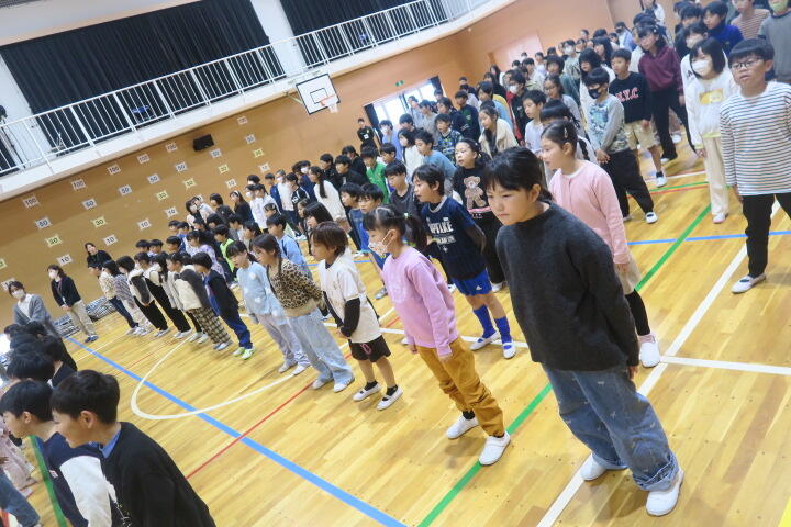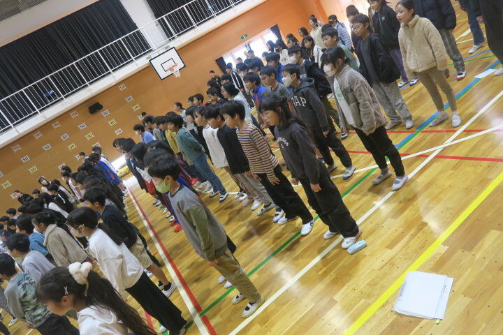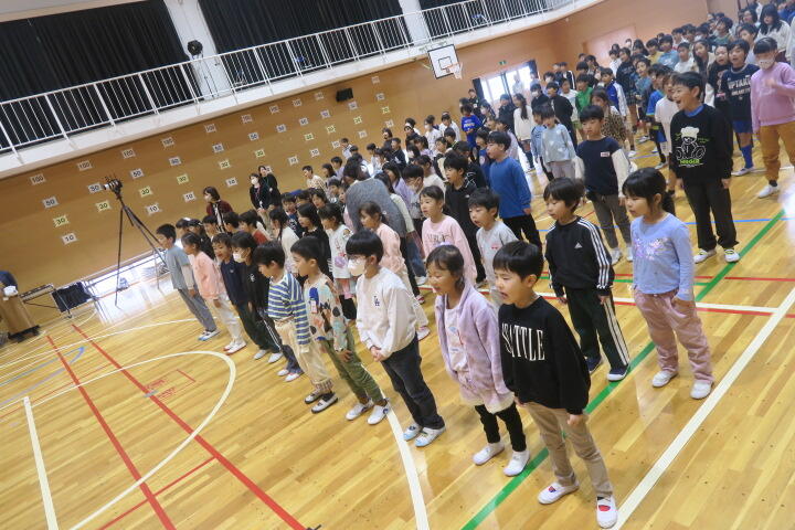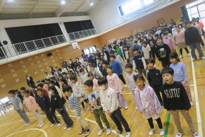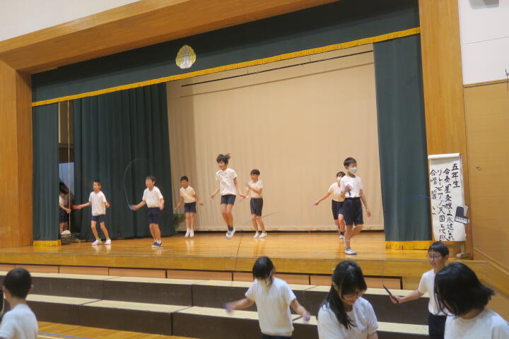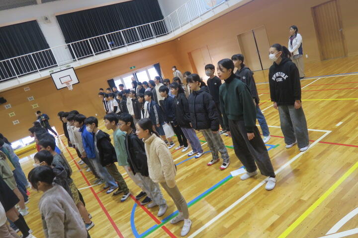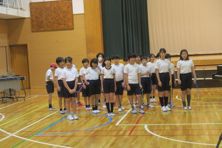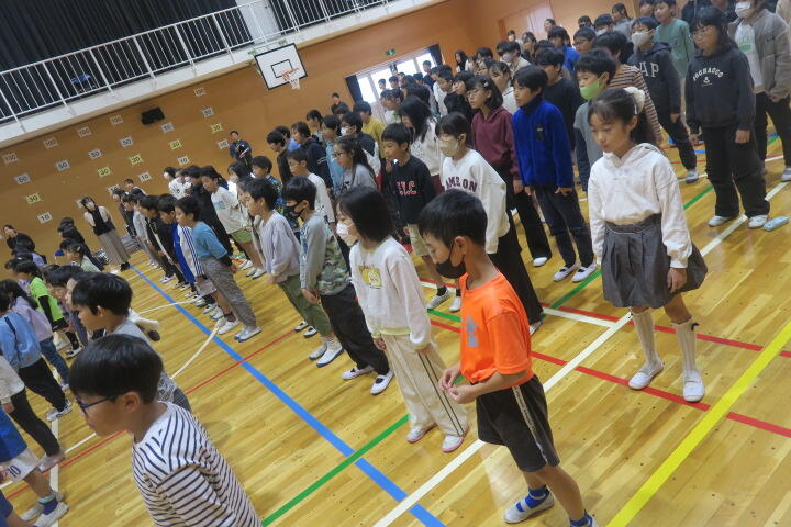 学年合同で体育館に集まり、本番と同じように練習していました。