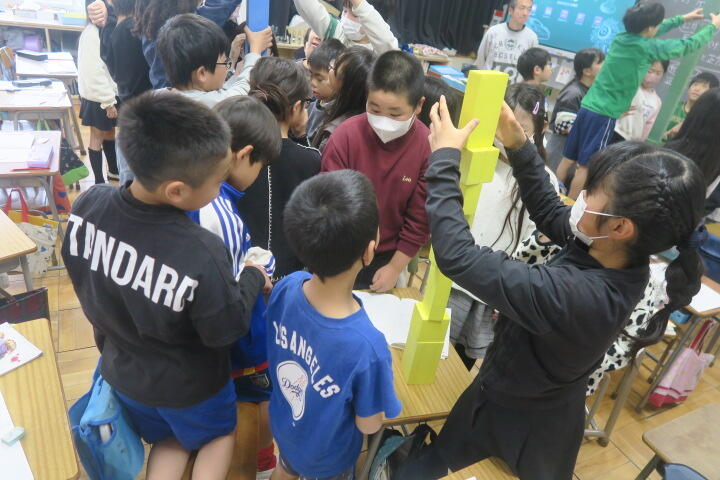 様々な形の立体をグループごとに積んでいるところでした。