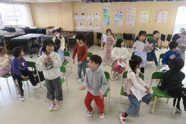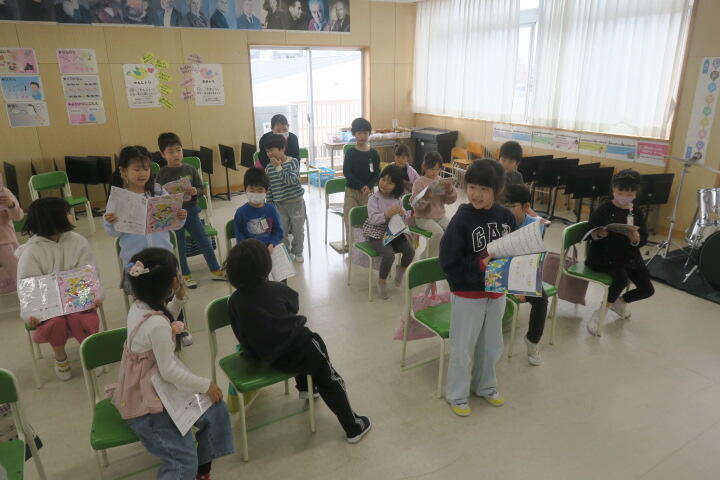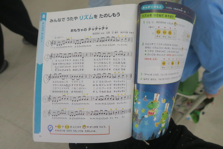 1組の音楽は合唱「おもちゃのチャチャチャ」の学習です。