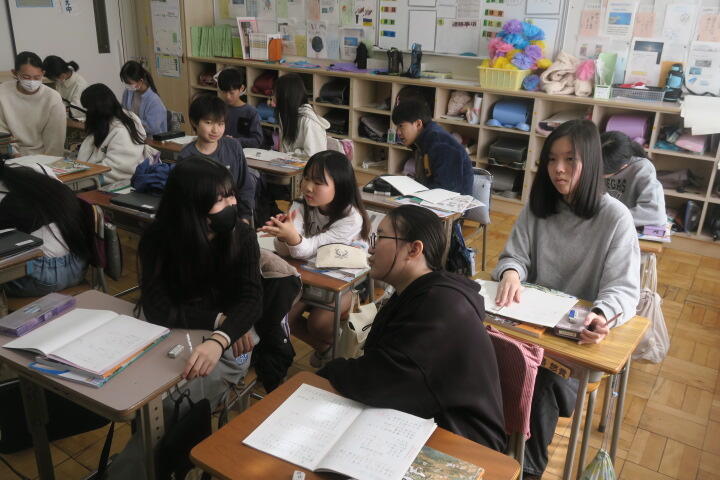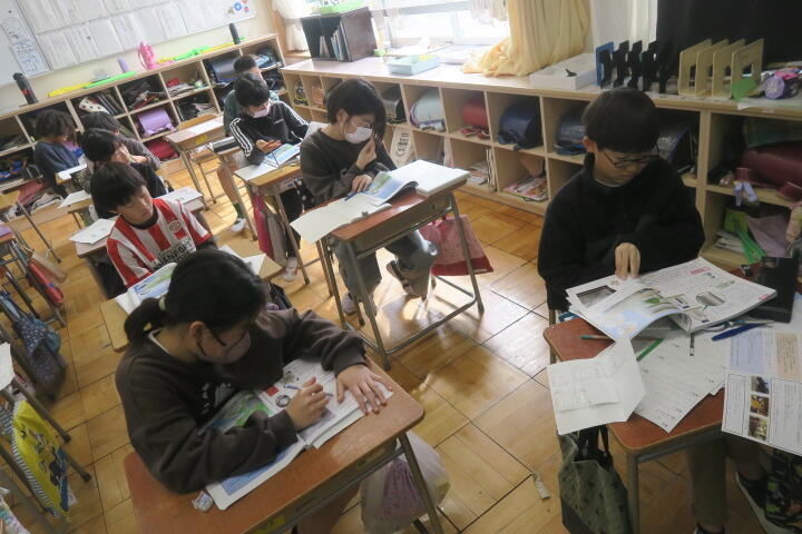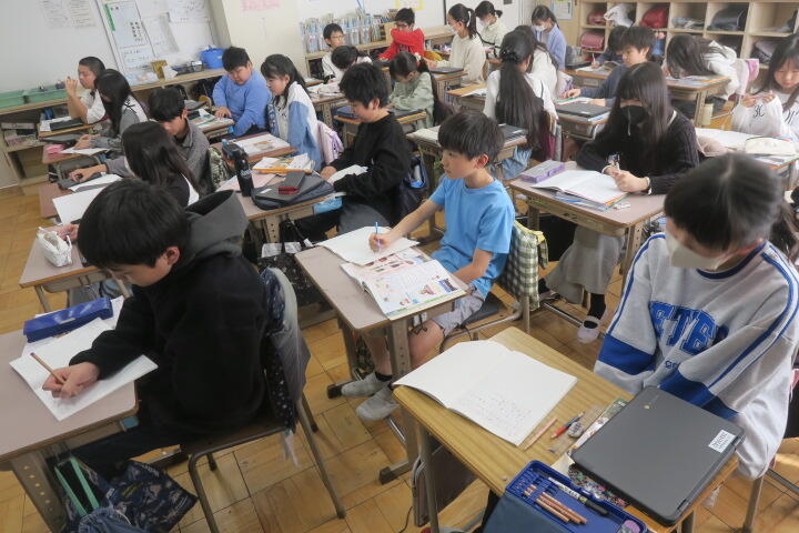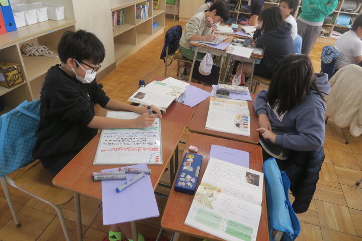 教科書を読んだ後、内容についてワークシートに書き込みながら、