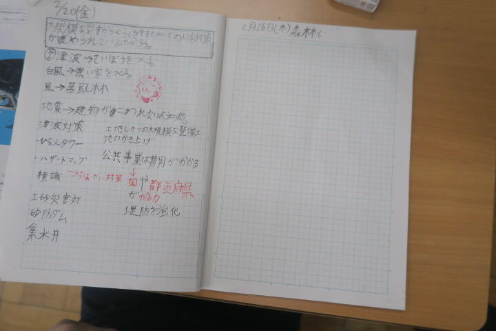 1組の社会は森林と災害についての学習です。