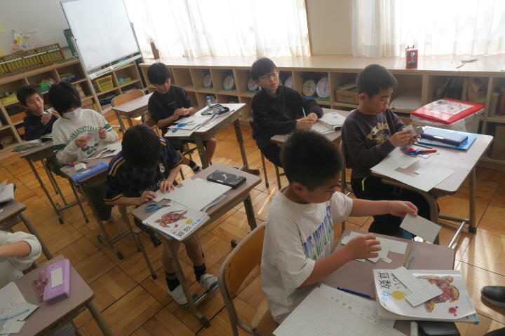 3年生の国語はグループごとに漢字の部首クイズをしていました。