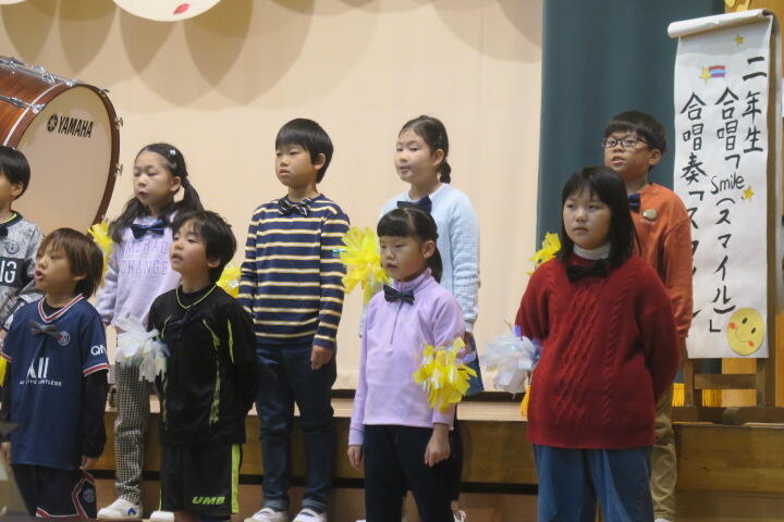2年生はチャップリン作曲の「Smile」を英語で合唱しました。合唱奏ではゆずの「スマイル」を演奏しました。合奏しながら歌もあり元気よく、笑顔で発表しました。
