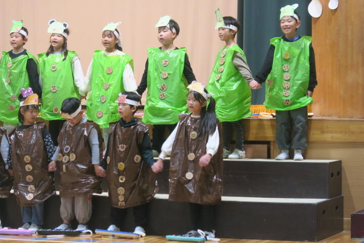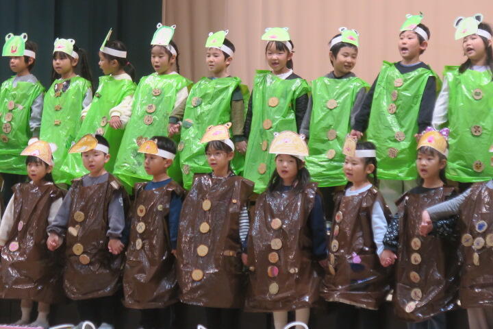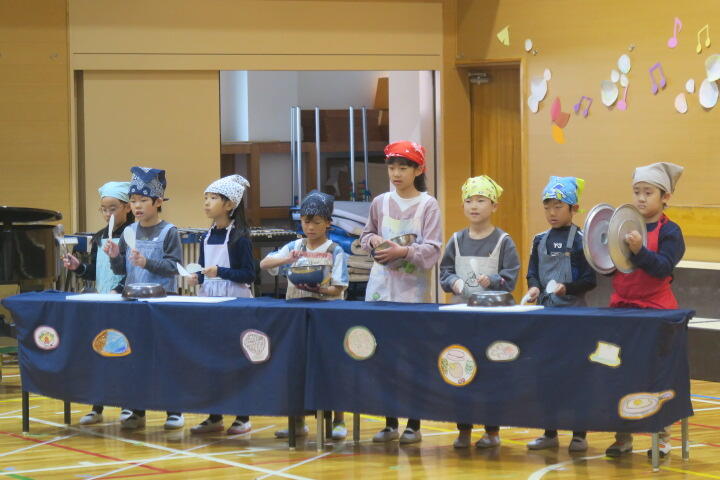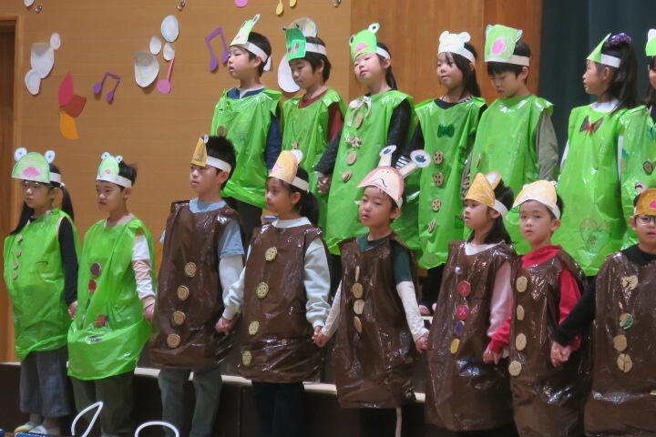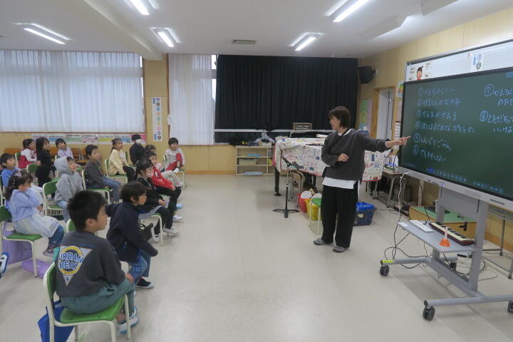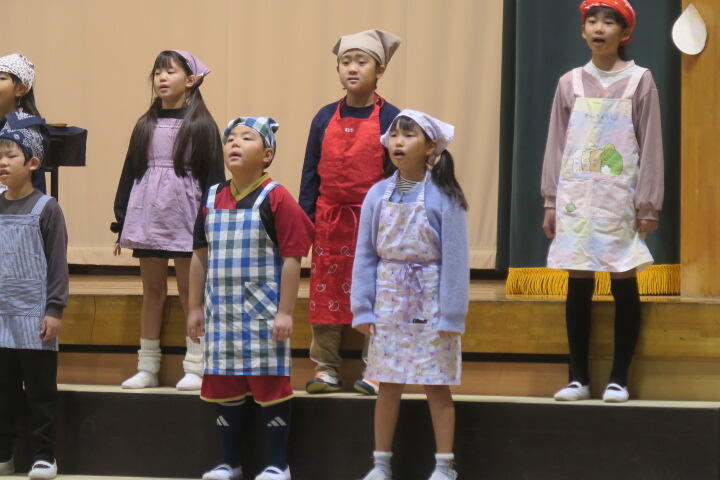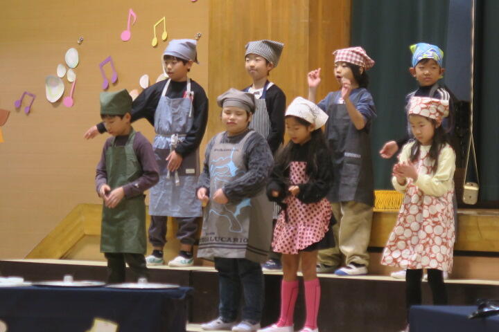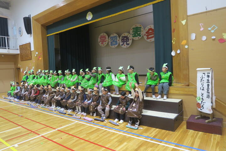 1年生は国語の教材にもなっている物語文「お手紙」を題材にした音楽物語です。