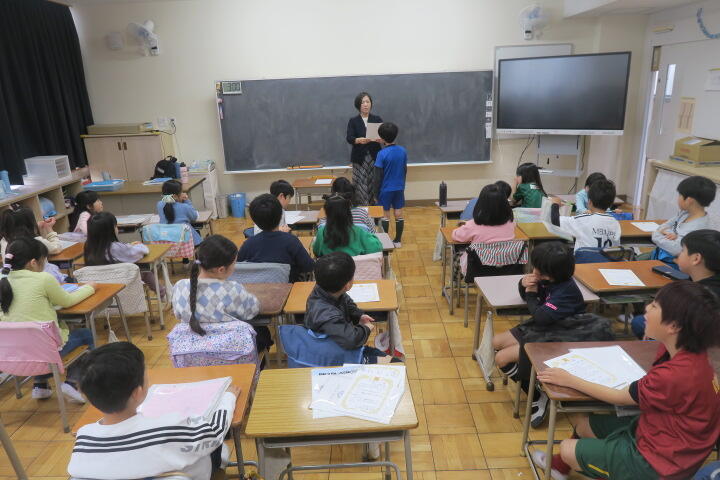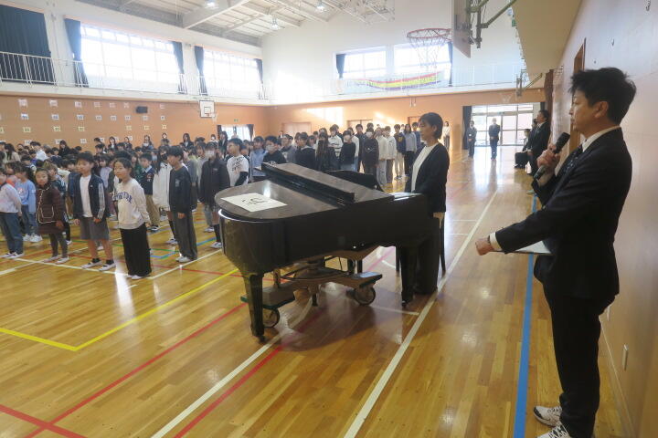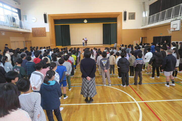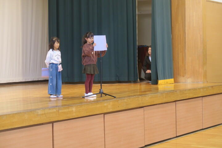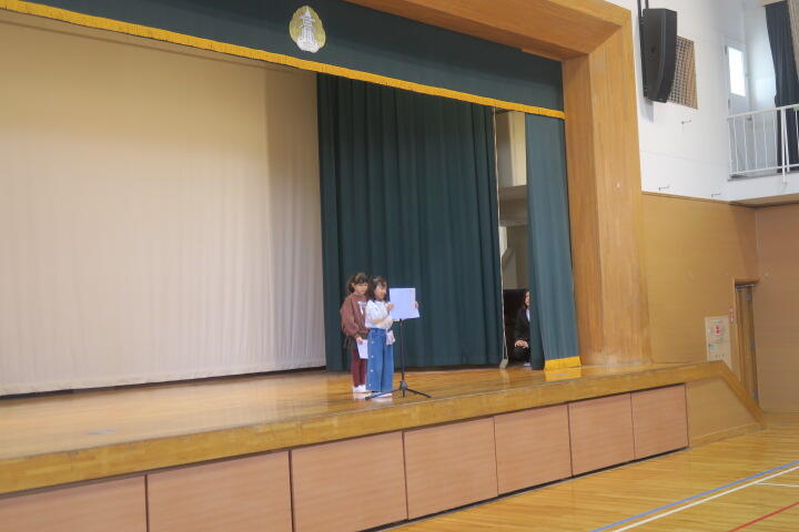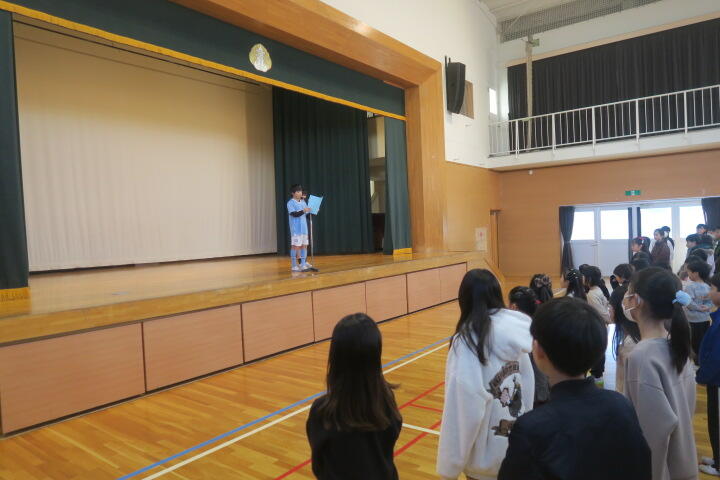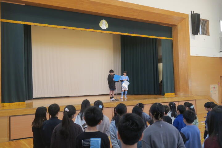 4年生の2名が立派に、全校児童の前で学期の目標と決意を発表しました。