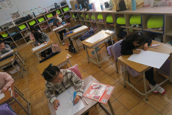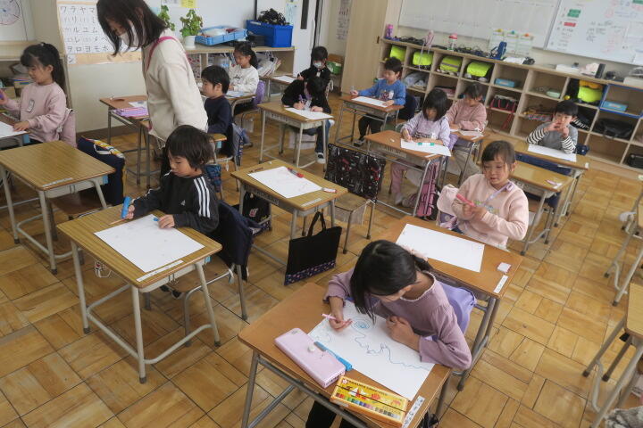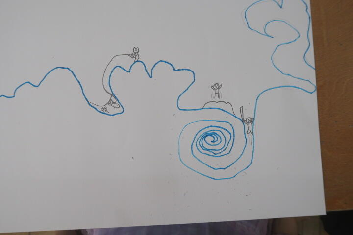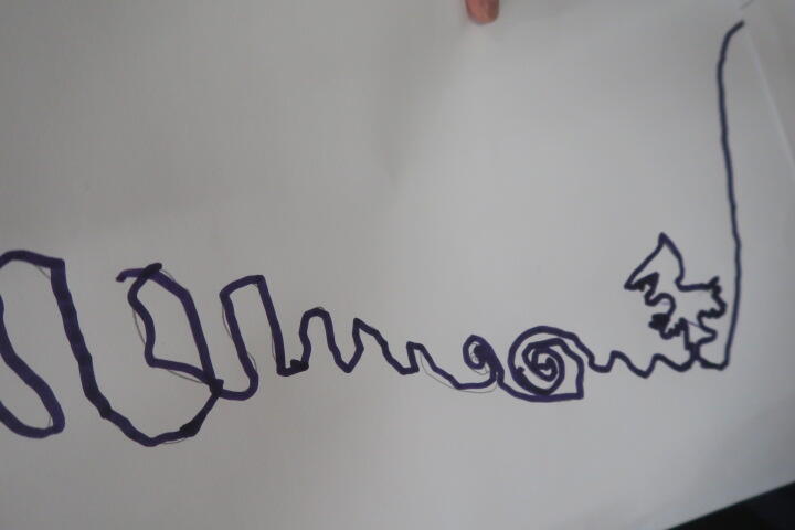 画用紙に1本の線で絵を描く学習です。