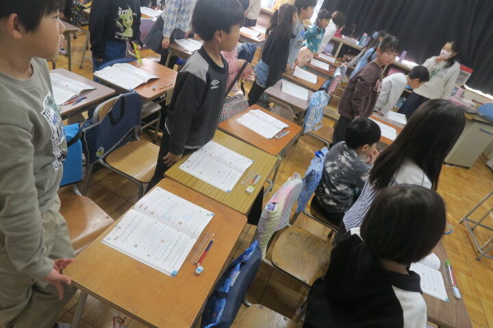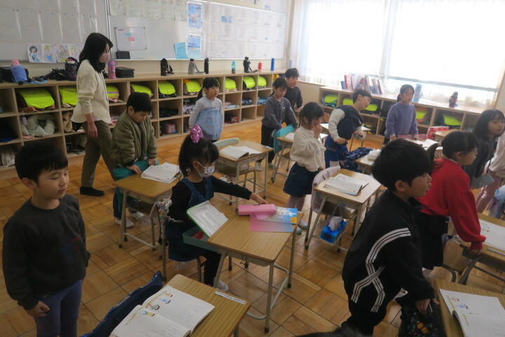 2年生の算数は宿題の音読カードを配っているところでした。