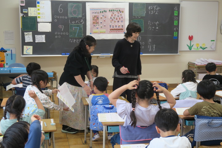 できた子は先生に持っていき、丸をもらっていました。