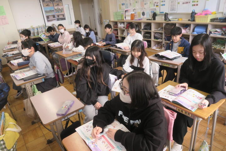 教科書を読んだ後、内容についてワークシートに書き込みながら、