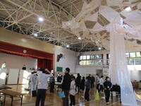 各学年が順番に立体作品や家庭科の作品を運び込みました。
