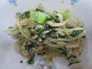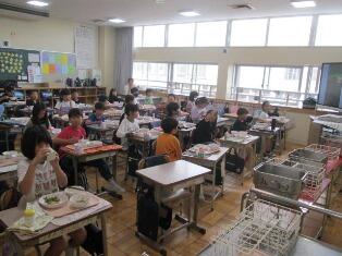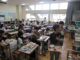 本日(10月1日(水))の給食は「ベジぱくDAY」でした。今月の野菜は「小松菜」です。もやしと小松菜のごま和えが提供されました。写真は1年生の様子です。