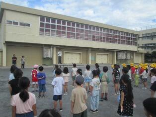 10月6日(月)全校朝会がありました。9月は月曜日が休みの日や暑い日が多く、2学期初めての校庭での全校朝会でした。運動会へ向けての校長講話の後、集会委員会の児童が今月の生活目標についての発表を行いました。