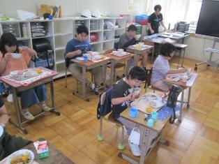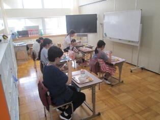11月21日(金)本日の給食も和食の日献立でした。ごはん・さばの塩焼き・煮びたし・いものこ汁が提供されました。写真はくわのみ学級5年生の様子です。
