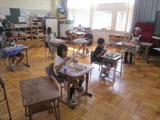 10月6日(月)本日は十五夜です。月見は旧暦の8月15日に月を鑑賞する行事で、この日の月は「中秋の名月」、「十五夜」、「芋名月」と呼ばれます。月見の日には、団子や餅(中国では月餅)、ススキ、サトイモなどを供えて月を眺めます。十五夜汁が提供されました。写真はくわのみ学級の様子です。