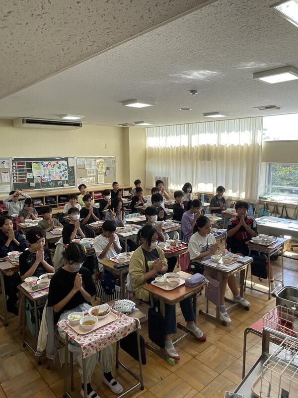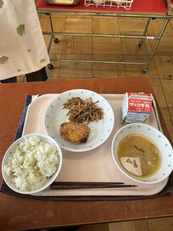 11月5日(水)本日の給食では十三夜にちなんだ献立でした。旬の栗を使ったご飯と、団子が入った十三夜汁が提供されました。写真は1年生の様子です。