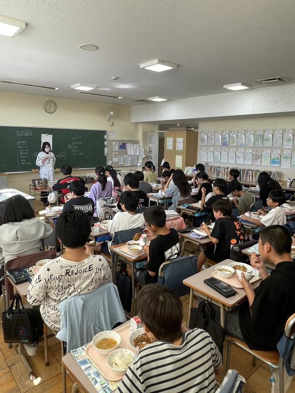 12月5日(金)本日の給食では、衣笠丼が提供されました。衣笠丼は京都府の郷土料理です。油揚げとねぎを卵でとじたあんをご飯にのせて食べます。写真は2年生の様子です。