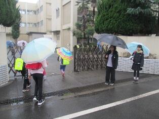 10月22日(水)登校時間は雨でした。6年生があいさつ運動に取り組んでいました。