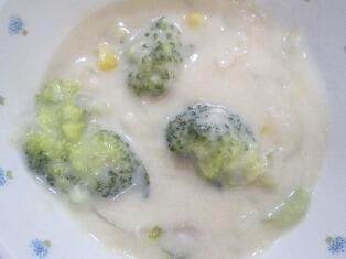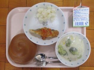 本日(11月4日(火))の給食は「ベジぱくDAY」でした。今月の野菜は「ブロッコリー」です。ブロッコリーの豆乳クリームスープが提供されました。写真は3年生の様子です。