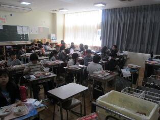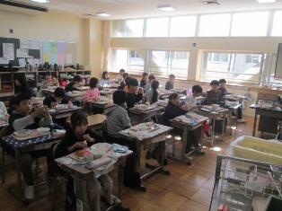 11月20日(木)本日の給食は和食の日献立でした。ごはん・小いわしのから揚げ・白滝と大根のピリからいため・すき焼き風煮が提供されました。写真は5年生の様子です。