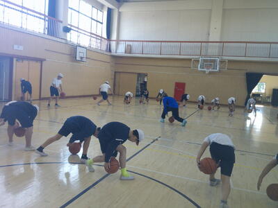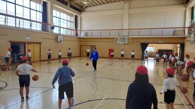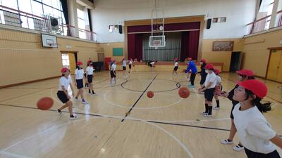 体ほぐしをしたあと、いろいろなドリブルの仕方やシュートの仕方などを教えていただきました。