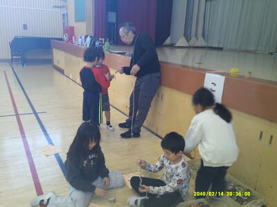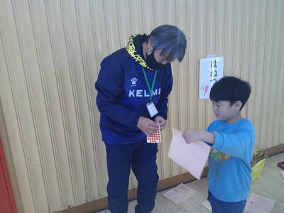 頑張って挑戦したら、「昔遊びの先生」たちに、シールをもらいました。