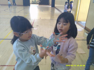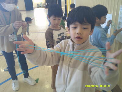 あやとりは、かべにはってある順番をよく見て、いろいろなものを作っていました。