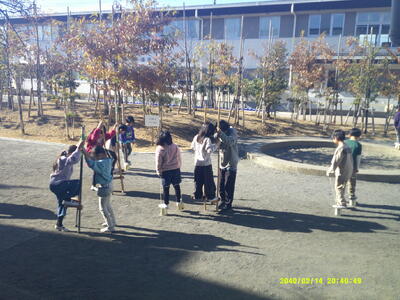 校庭では限られた場所の中で、20以上の班が工夫しながら遊んでいました。