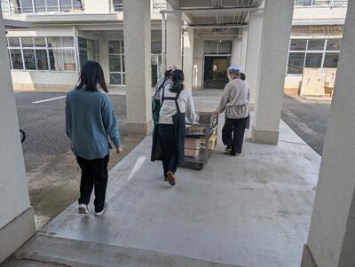 配膳室からワゴンで給食を運びます。