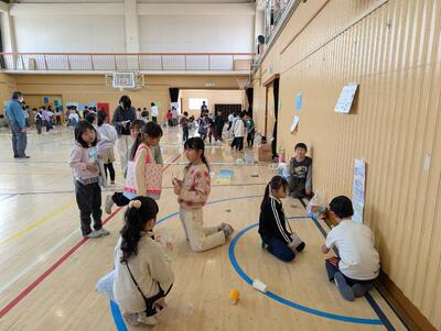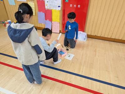 今、2年生は生活科の「せかいでひとつわたしのおもちゃ」の学習で、身近なものを使って動くおもちゃを作ったり、それを使って遊んだりする活動をしています。