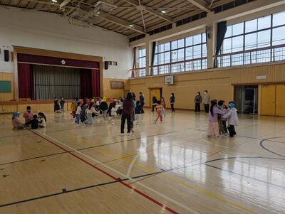 次に体育館で学年全員と柏保育園のみんなで、じゃんけん列車ともうじゅうがりゲームをしました。
