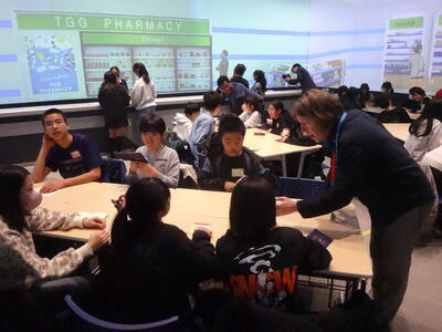 「トラベルエージェンシー」「ファーマシー」「ファストフード」の3つの場面を想定して、英語を使ってやり取りを行いました。