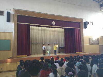 終演後には各学級2名ずつの和太鼓体験があり、最後はたまっ子座の皆さんとハイタッチをしながら、気持ちよく退場していきました。