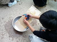 お面を持って、塗り残しがないか、いろいろな角度から見て塗っていました。