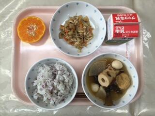 今日の給食メニュー:ゆかりご飯、おでん、辛子醤油煮、ポンカン、牛乳。
