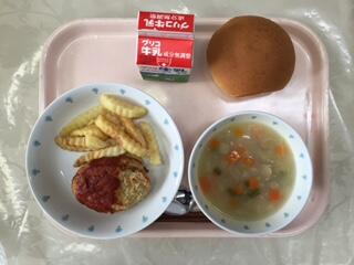 今日の給食メニュー:ヘルシーハンバーグ、フライドポテト、とろとろ豆スープ、丸パン、牛乳