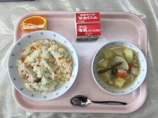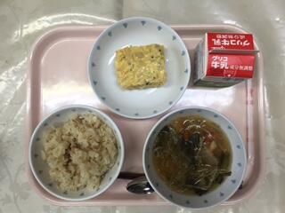 今日の給食メニュー:シーチキンご飯、中華風卵焼き、春雨スープ、牛乳