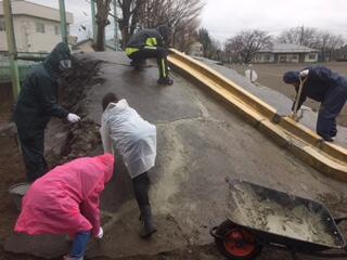 この作業中も、PTA会長さんは、「やばいっ!すごく楽しくなってきた!」とつぶやきながら取り組んでいました。わかります。私も同じ思いでした。結局用意したセメントでは足りなくなって、砂とセメントを買いに行きました。