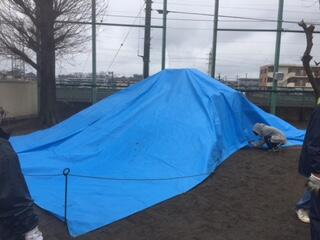 雨が降っていたので、上野副委員長の勧めもあり、ビニールシートをかぶせました。この後片付けをして、終了したのは1時を大きく過ぎていました。