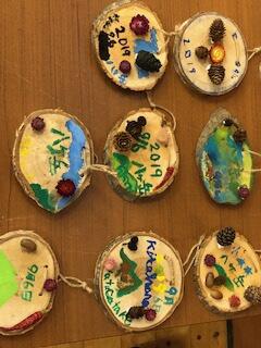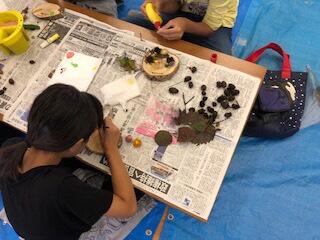 間伐材を切った板に、昨日のハイキングで拾った木の実や用意してくれたドライフラワーなどをつけたり、絵を描いたりして作ります。