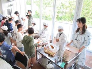 調理場では、今日食べる給食がどのように作られているかを、栄養士さんに案内してもらいながら見学しました。