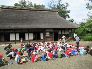 午後は古民家園を見学しました。江戸時代に建てられた家を移築し、重要文化財として残しています。大きな茅葺の屋根や広い畳部屋、土間や囲炉裏も見ることができました。