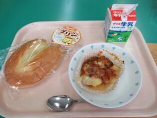 今日のメニューは「ソフトフランスパン、タラのピザ風焼き、豆乳プリン、牛乳」でした。