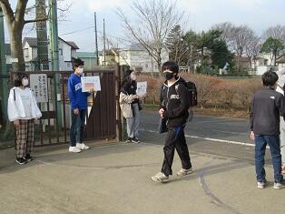 朝、校門に立って挨拶運動をしています。