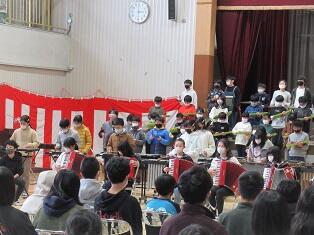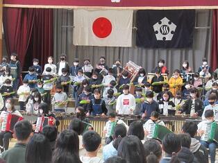 その後、運動会で一緒に表現をした演技の中の曲「Documentary film」を合奏で6年生に贈りました。