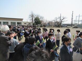 最後の送り出しには、5年生も駆けつけ、保護者の方と一緒に卒業生を見送りました。