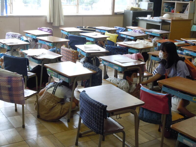 1学期最後の避難訓練がありました。今回は地震を想定しての避難でした。訓練の放送が流れたら、各自机の下にもぐり、頭を守り、校庭に避難しました。