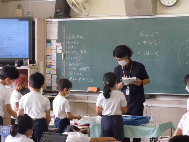 始業式後、各クラス様々な様子が見られました。夏休みの宿題集めのクラス、夏の思い出発表大会のクラス、いきなりテストのクラス、身体計測のクラス。