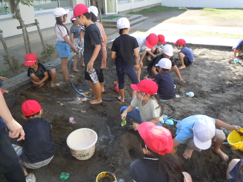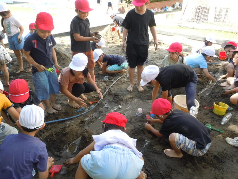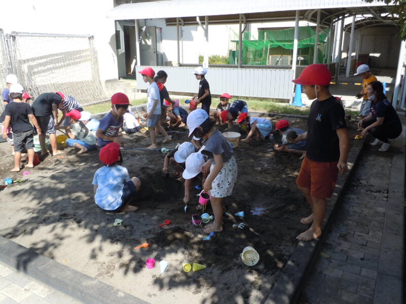 1年生生活科の授業の様子です。砂場で山を作ったり、川を作ったり、泥団子を作ったりして、砂とかかわったり友達とかかわったりしながら砂体験をしていました。砂の上に水を流そうとする「なんで水が流れないの?すぐに水がなくなる」との疑問をもつ児童もいて、これからの学習が楽しみです。