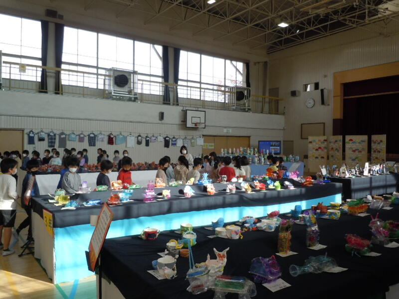 「子どもSDGs美術館」のテーマのもと、令和4年度の展覧会が行われました。体育館では立体作品の展示、教室前には平面作品の展示をしています。各学年の良さが表れた展示でした。子供たちは友達の作品をじっくり鑑賞していました。