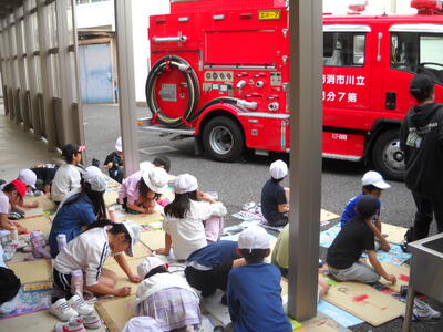 本日、立川消防署の消防隊員の皆さん、そして地域の安全を守る消防団の皆さんが、真っ赤な消防車とともに学校へ来てくださいました。子どもたちは間近で見る消防車に大興奮でした。